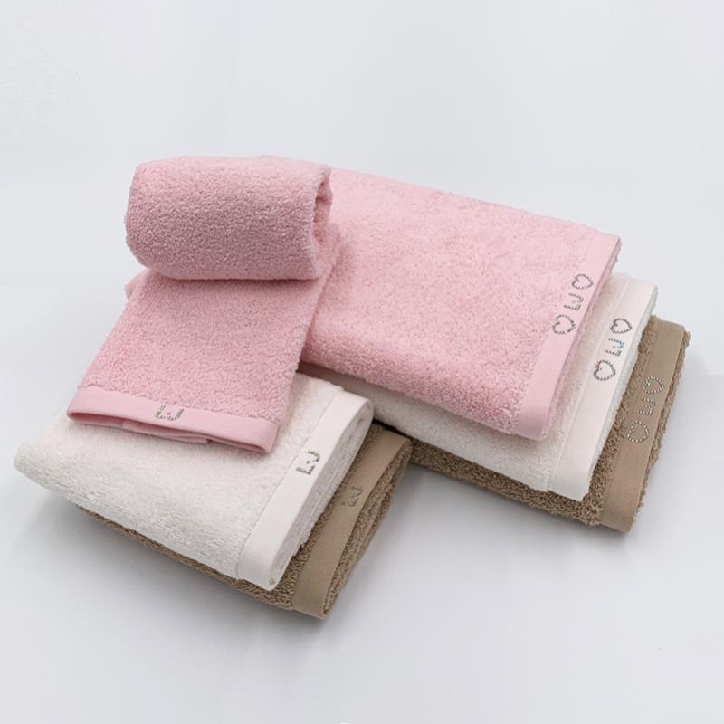 Coppia Spugna composta da un telo viso cm 56x100 con logo LJ e applicazione 2 cuori e un telo ospite cm 38x58 con logo LJ.