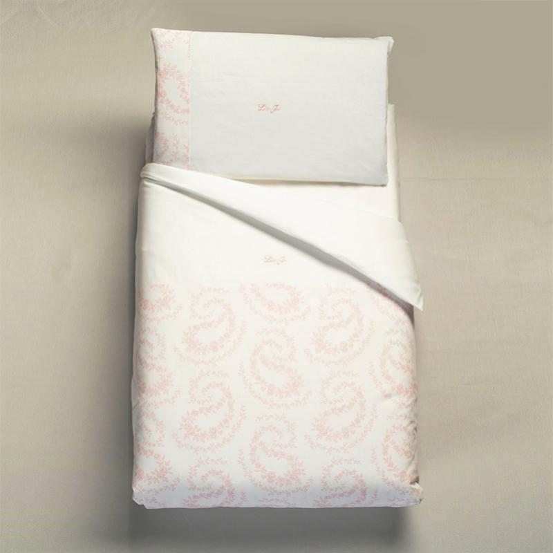 Completo copripiumino 4 pezzi per culla o carrozzina composto da: un sacco copripiumino 70x95 cm con logo Liu Jo ricamato, un interno per sacco, un lenzuolo sotto con angoli e una federa 45x30 cm con bordo laterale in tessuto stampato e logo Liu Jo ricamato.