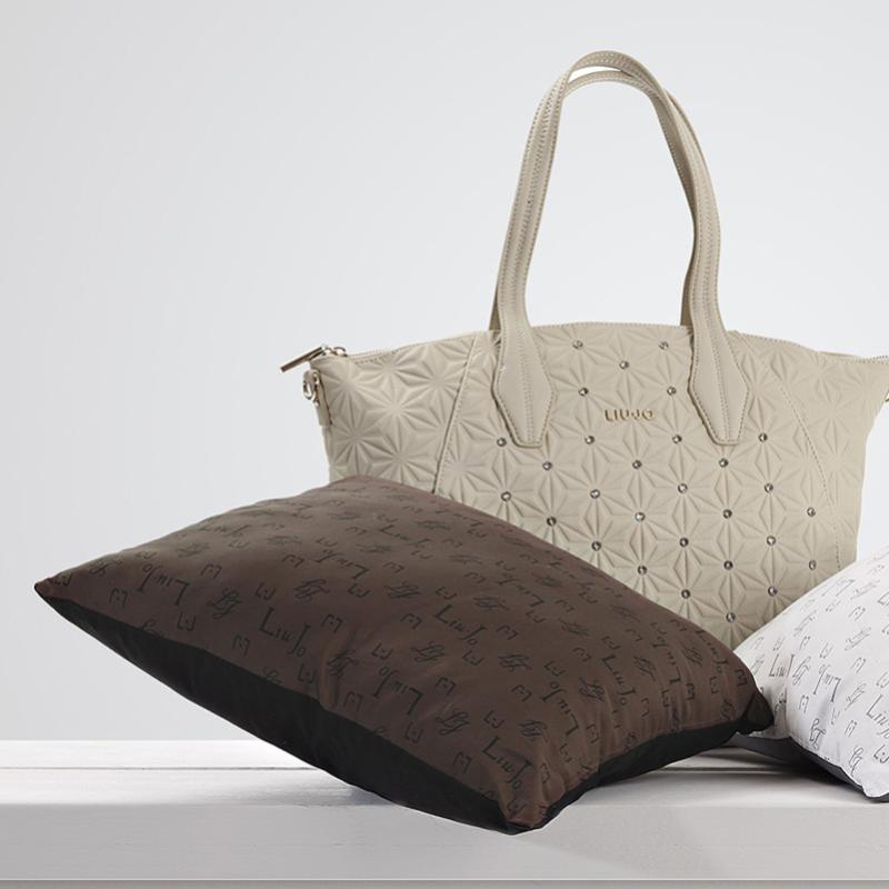 Cuscino arredo cm 40x40 con stampa Liu Jo sul fronte e tessuto in cotone tinta unita sul retro.